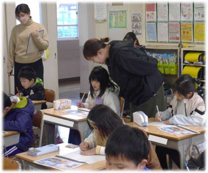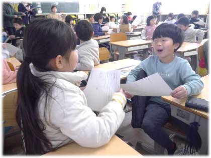 1年2組で、国語科の研究授業が行われました。毎日、担任と一緒に一生懸命、元気よく学習を積み重ねている1年生の様子を見るために、教職員が続々と2組の教室を訪れました。自分たちのがんばりを見てもらおうと、自分で考え、友達と考え合う姿を示した1年生に成長を感じます。今週の金曜日に行われる入学説明会での園児との交流でも、きっとすてきなお兄さん、お姉さんの姿で関わってくれることだろうと期待感が高まります。