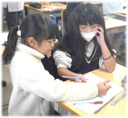 4年1組は、単元「変わり方」の学習を行っています。2つの量の関係を表で表したり、ことばの式で考えたりして、変わり方を全体で考え合います。表に書くことで、2つの量の変わり方や関係がつかみやすくなりますね。その後、練習問題に臨み、変わり方を一人調べで考えていきます。途中、互いの考えを交流させながら、自分の考え方に自信をもったり、友達の考え方から自分の考えを捉え直したりする4年生の姿が見られました。