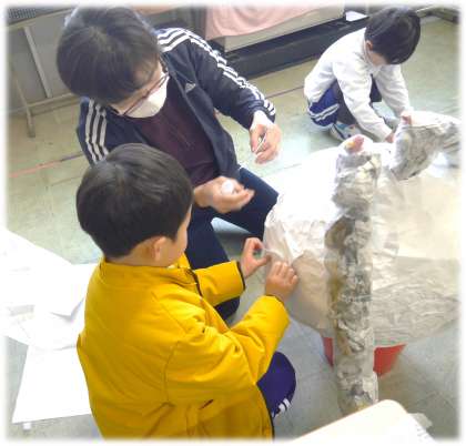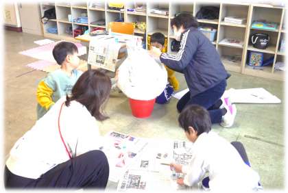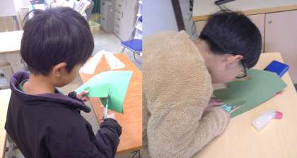 1月31日(金)6・8組 学習発表会に向けて 公開日 2025/01/31 更新日 2025/01/31 各学年から みんなで協力しながら、学習発表会で使う「ある物」を制作中です。丁寧に白い紙をのりで張り付けたり、色画用紙を形に切り抜いたりと、役割分担をしながら、熱中して作っています。みんなで協力すると、楽しく、そしてスピードもアップですね。 5678組