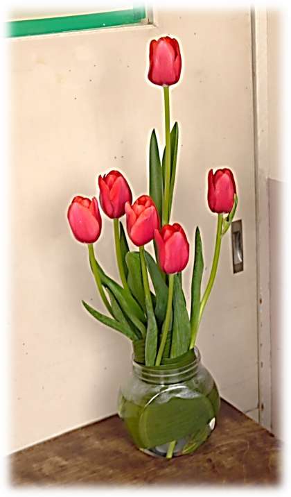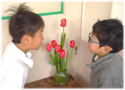 ある教室前には、美しいチューリップが飾られていました。暦のうえでは、「春」であることを少しでも子どもたちが感じられるように、担任が用意したもののようです。早速、花瓶に気づき、「きれいだな。いいにおいがするかな?」と、チューリップに集まってくる子どもたち。担任の思い、子どもの感性、どちらもすてきだなと感じる朝の風景でした。