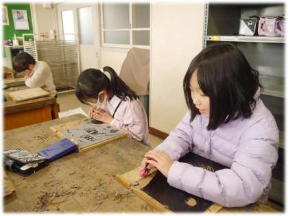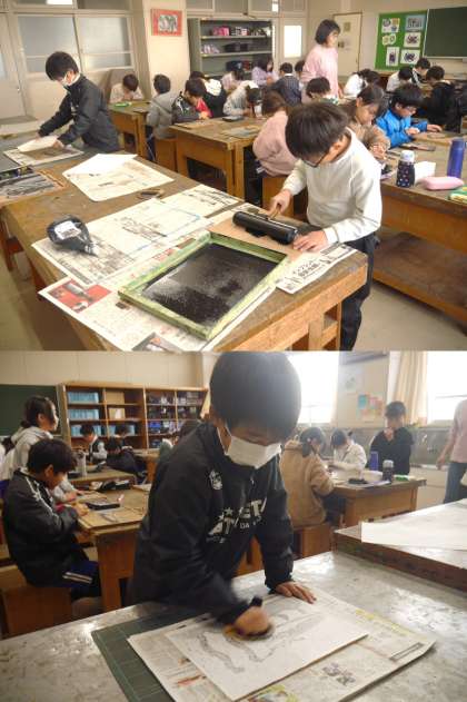4年2組は、彫り筋を考えながら、彫り進めています。安全に彫るために、彫刻刀を動かす方向を意識したり、利き手と反対の手の役割分担を意識したりして、彫り筋が生きる作品づくりに取り組む4年生です。一色刷りでも、彫り方でずいぶん多彩で味のある表現に仕上がってきました。