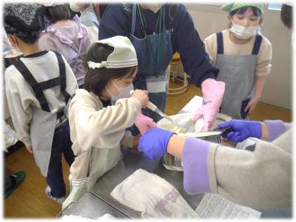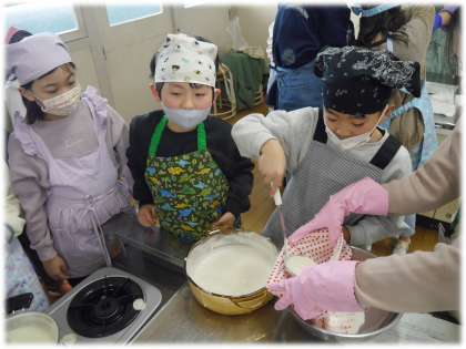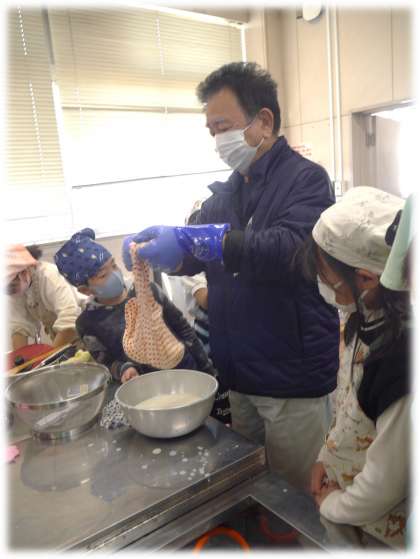 呉汁を絞る作業は、熱くてあぶないため、保護者ボランティアの方にサポートしてもらいます。絞る様子を熱心に見ながら、絞り袋に残った「もの」にも興味津々でした。