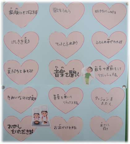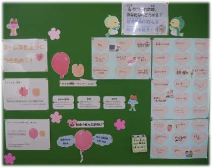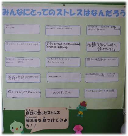 2月6日(木)保健室前の掲示板に注目です! 公開日 2025/02/06 更新日 2025/02/06 各学年から 2月に入り、保健室前の掲示板も一新されました。今月は、ストレスとの上手な付き合い方がテーマです。保健委員の5・6年生の「ストレスを感じるとき」や「ストレスの解消法」が紹介されています。 「そうそう、これストレスなんだよね」 「そうか、こんな方法もあるんだな」など、共感したり、新たな解消法を見つけるヒントになったりする内容となっています。