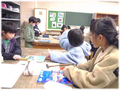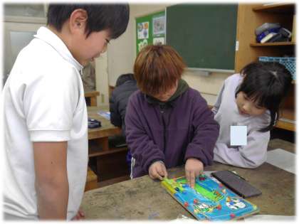 3年3組では、釘を打ってビー玉の経路を作り、楽しく遊べる作品づくりに取り組んでいます。今日は、いよいよ完成。作品名を貼り、自分の作品の振り返りをしたら、早速、自分や友達の作品で遊びます。