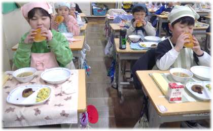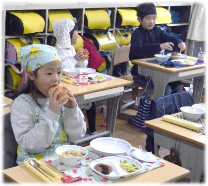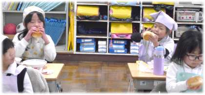 祝日明けの今日、朝から多くの子どもたちが、「今日の給食は、りんごパンが出るよ!」と、うれしそうに報告してくれました。以前、テレビでも豊田市の給食が取り上げられ、市内中学校の給食風景が放映されていました。その中でも人気だった「りんごパン」。1年生の給食の様子をのぞきにいくと、やはりおいしそうにりんごパンを食べるすてきな笑顔に出会えました。りんごパンをはじめ、いつもおいしい給食を考え、届けてくれる関係者の方に感謝ですね。