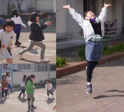 2月17日(月)1年生 生活科の授業の様子 公開日 2025/02/17 更新日 2025/02/17 各学年から 1年2組では、昔あそびの学習で、地域の方から遊び方のこつを学びました。その後、さらに自分たちでも練習を続け、その中で自分なりに「こうすれば、上手にできる!」というポイントを学級の仲間に伝え合っていました。今日は、竹とんぼとはご板です。友達の気づきを共有し、その後実際にみんなでそのポイントを意識して遊んでみました。みるみる上達し、楽しくなって夢中で遊ぶ様子がすてきでした。 1年生