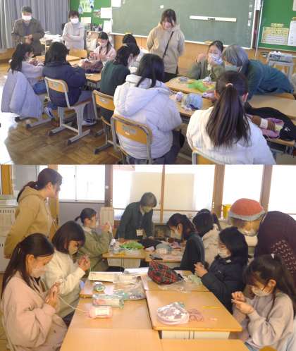 (写真中)編み物クラブ ボランティアの方が毎回やさしく、ていねいに編み方を教えてくださいました。「はてなの会」のみなさん、ありがとうございました。