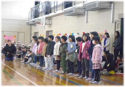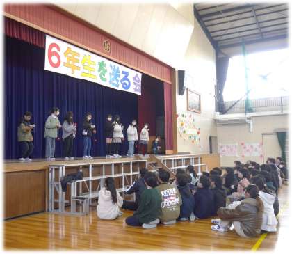 続いては1年生の出番です。今年度、6年生と一番かかわりが深かったのが1年生です。登下校でのかかわり、休み時間に一緒に遊んでもらう、清掃時間は一緒に活動する、など。1年生にとって6年生は、優しくておもしろくて、かっこいいお兄さん、お姉さんなのです。