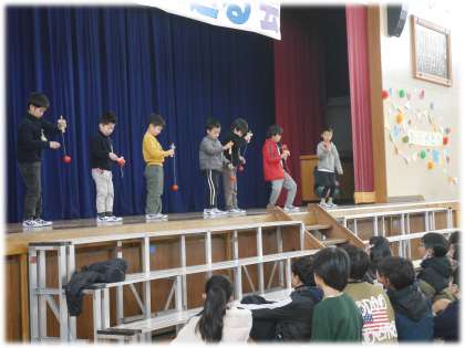 まずは、けん玉です。やさしい6年生は、舞台上の代表の1年生に「すごい!」「あとちょっと!」「がんばれ!」と、あたたかいエールを送っていました。
