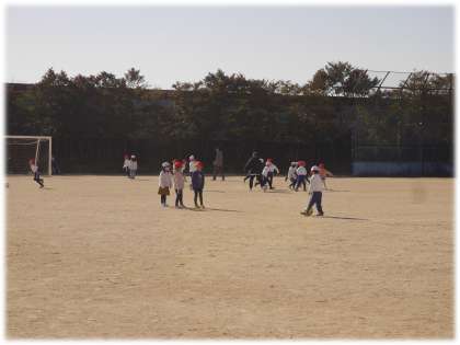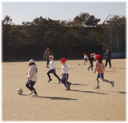 1年2組は、運動場で元気よくボール運動に取り組んでいます。グループに分かれて、相手にちょうどよいバスを蹴ったり、受け止めたりしながら、みんなでボールを回しています。ドリブルもスピードにのっていました。