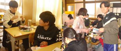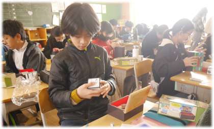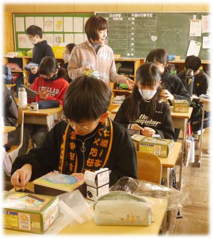 6年1組では、卒業制作のオルゴールづくりが完成間近です。今日は、ふたの部分を本体に取り付けて、中に校歌を奏でるオルゴールを組み入れました。また、ふたの内側には、お気に入りの写真を入れることができるようにプラスチックケースを取り付けます。