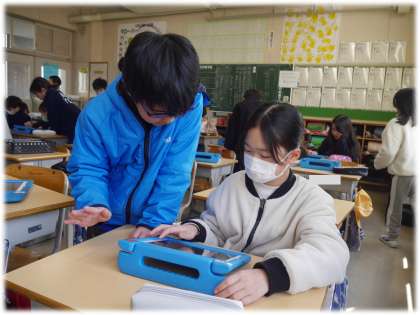 自分の指令どおりに画面上に赤い忍者が次々と「にんにん」と言いながら増えていく様子を楽しんでいます。また、困っている仲間には、いつもの授業のように、言葉で説明をていねいに行い、相手が納得するようにかかわる姿も見られました。