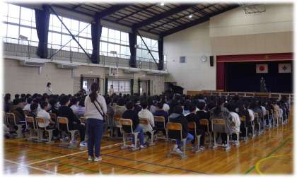 在校生の卒業式練習が始まりました。在校生にとっては、卒業式の多くの時間は、じっと姿勢を正し、「待つ」時間です。しかし、その時間にも6年生の卒業を祝う気持ちを込めることができるのだと、教務主任が練習冒頭に語りかけます。所作に込める思いのカタチ。在校生は、その話に真剣に聞き入り、その後の練習に意識した姿を示し始めます。練習は始まったばかり。けれども、在校生の6年生を思う気持ちが体育館を満たし始めていました。