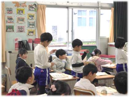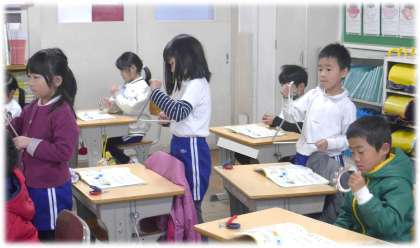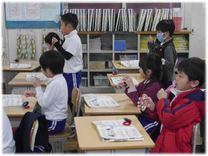 1年1組は、「こいぬのマーチ」をタンバリン、カスタネット、トライアングル、すずの4種類の楽器を使って合奏しています。前半のタンバリンとカスタネットのリズム伴奏が上手に演奏できると、後半はトライアングルとすずで拍の長さの違うリズム伴奏に挑戦していました。学級みんなのリズムを合わせるために、楽器担当ではない人は、階名を一生懸命歌い、リズムが刻めるようにしていました。難しさもありますが、成功したときは「うまくいった!」と、うれしそうでした。