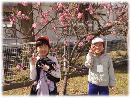 紅梅や白梅の木の下では、2年生と一緒に梅の香りを楽しみました。