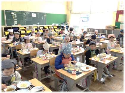 3月24日(月)は午前のみのため、今年度の給食は今日が最後でした。この学級の仲間と一緒に食べる最後の給食。1年生の教室をのぞくと、みんな楽し気に、そしておいしそうに給食を食べています。