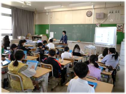 1組は、学習用タブレットを「学習の友達」にするために、4年生の学習に役立つアプリを学級で確認し、自分のタブレットにインストールする時間を設けていました。授業はもちろんのこと、家庭での自学でもどんどん役立て、自分の力を高め、磨いていきたいですね。
