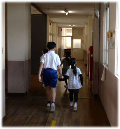 昨日の5校時、今年度最初となる通学団会を行いました。1年生にとっては、初めて自分の教室以外への移動となり、同じ通学班の上級生が教室まで迎えに来て、一緒に通学団の教室へ向かいました。