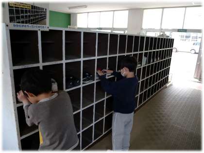 1年2組の子どもたちが、下足でみんなの靴をぴしっとそろえていました。