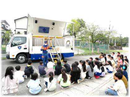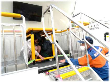 4年生は防サイ君での、地震体験です。まず、消防署の方から「地震が来たときに、まず頭と首を守ることが大事」であることを教えてもらい、実際に震度6強の揺れを体験します。