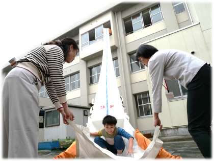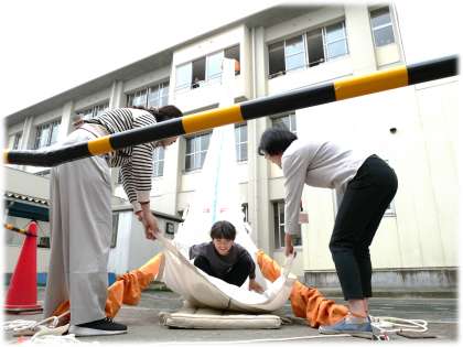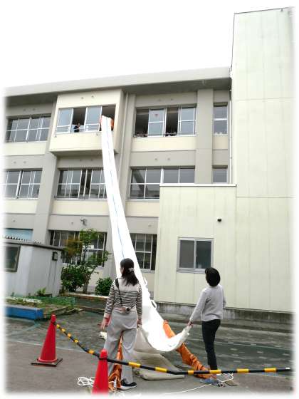 5・6年生は、救助袋を使って校舎3階からの降下訓練です。一人ずつ、降下の姿勢に気を付けて、滑り降りていきます。高所に対しての恐怖心があった人もいますが、後ろにいる仲間の命を守るためにも、勇気を出して訓練に臨む姿も見られました。