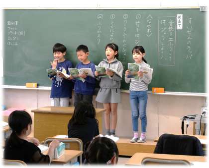 4月21日(月)3年生 国語科の授業の様子 公開日 2025/04/21 更新日 2025/04/21 各学年から 3年1組では、単元「すいせんのラッパ」の音読発表会を行っていました。グループごとに、場面を選び、様子が思い浮かぶように工夫して音読します。その様子をじっくり見て、聴きながら、発表グループのすてきなところを探す3年生です。 3年生