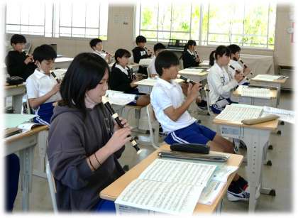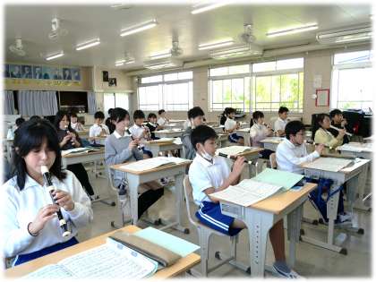 4月21日(月)6年生 音楽科の授業の様子 公開日 2025/04/21 更新日 2025/04/21 各学年から 6年2組は、リコーダー演奏の練習に取り組んでいます。音階の初めて習う音の運指を確認し、なめらかに音を出すことができるように繰り返し練習していました。教科担任の合図に合わせて、きれいな音色が音楽室を包んでいます。 6年生