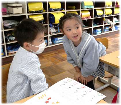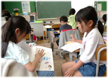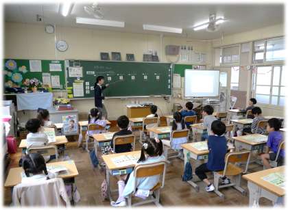 (写真下)1年2組 5以上の数の読み方も元気よく読んでいます。