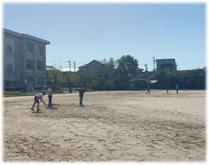 昨日の雨と一斉下校でコンディションが悪い運動場。登校時に、6年担任と一緒にでこぼこの部分を整備している6年生と5年生の姿がありました。自分の時間をみんなのために、学校のために使っている姿に頭が下がります。