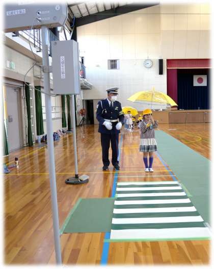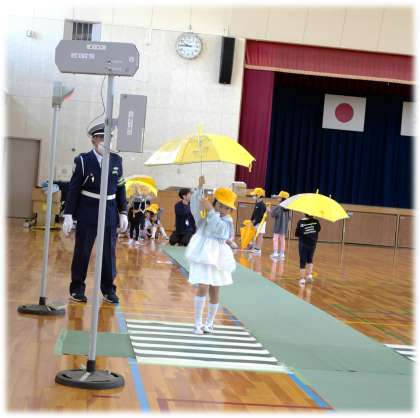 4月24日(木)1年生 交通安全教室の様子3 公開日 2025/04/24 更新日 2025/04/24 各学年から 傘をさしながらの歩行についても学習しました。黄色の傘の一部が透明になっている理由がよく分かりましたね。 1年生 5678組