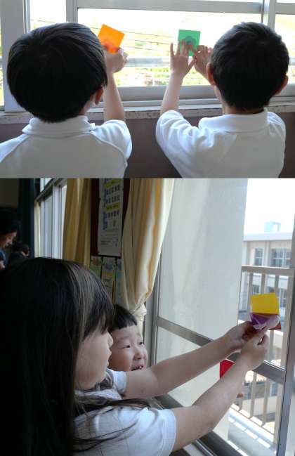 色紙にいろいろな「物」を重ねて、光を通したときの様子を楽しそうに試しています。