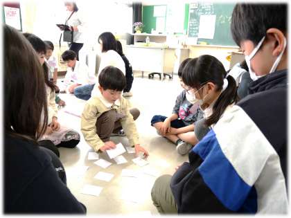 5月2日(金)なかよしはじめの会2 公開日 2025/05/02 更新日 2025/05/02 学校の特色ある活動 最初は、6年生が準備をした互いの名前を早く覚えるためのカードゲームを行いました。カードも6年生の手作りです。名字と名前が合わさると、素敵な図柄が現れるような工夫したカードで、神経衰弱を楽しく行いながら、互いの名前を覚えていきます。 1年生 2年生 3年生 4年生 5年生 6年生 5678組 特色ある活動