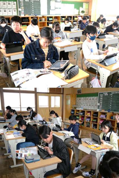 (写真上)6年1組 社会科 学習のまとめとして、自分たちでテスト問題を考え合っています。その際、疑問に思ったことは復習することで自分の理解につなげています。