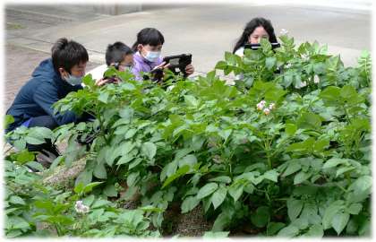 (写真下)6年3組 理科「植物の体のつくりとはたらき」の学習が始まりました。まずは、5・6・7・8組が育っているジャガイモ畑の様子を観察しました。葉や茎、花の様子をタブレットでも撮影していました。