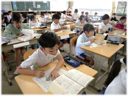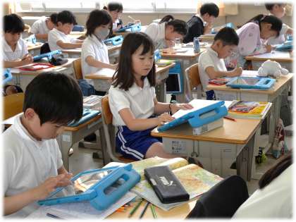 5月14日(水)4年生 今日の授業の様子 公開日 2025/05/14 更新日 2025/05/14 各学年から (写真上)4年1組 社会科:愛知県の産業や農業の特色をワークシートにまとめています。各市町村の特産を調べながら、イラストや文字で地図上に書き入れています。 (写真中・下)4年2組 国語科:辞書の使い方を学んでいます。辞書を引くときに気を付けることを確認しながら、実際に調べ学習を行っています。 4年生