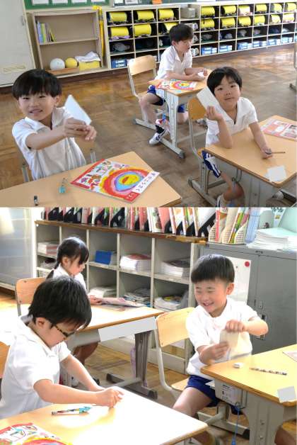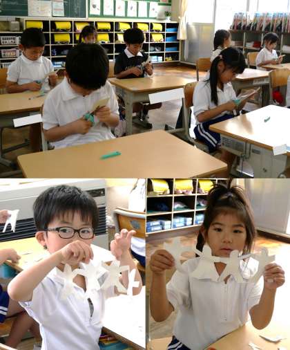 5月15日(木)1年生 今日の授業の様子 公開日 2025/05/15 更新日 2025/05/15 各学年から (写真上)1年1組 体育科:体育館で整列や体操の隊形など、担任の先生の指示に合わせて、動き方を学んでいました。 (写真中・下)1年2組 図画工作科:ちょきちょきかざりに挑戦しています。はさみを上手に使いながら、手をつないだ友達のかざりをつくっています。みんな、楽しそう! 1年生