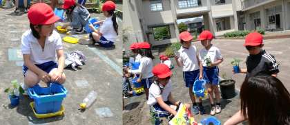 (写真上)2年1組 生活科:待ちに待った野菜の苗植えです。「ふかふかのおふとんのように土を入れるよ」と、準備を進める2年生です。