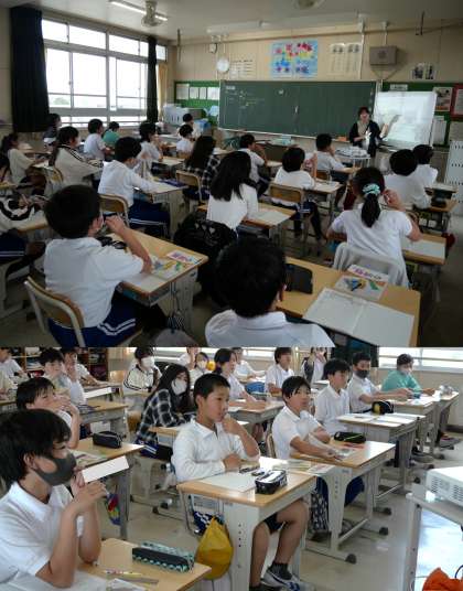 (写真下)6年3組 家庭科:いもの調理について、5年生で学習した野菜の調理を振り返りながら考えています。色の変化、かさの変化、硬さの変化など、調理によってどのような違いが出るのかを考え合っていました。
