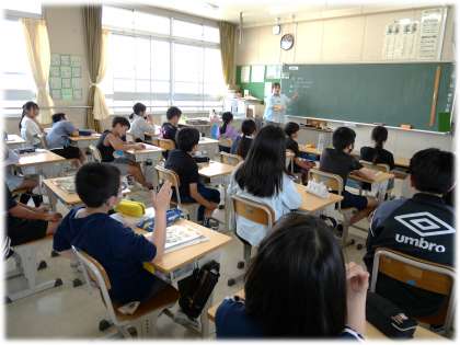 (写真中)6年2組 算数科:幅が同じで高さが変化していくときの面積について求めようとしています。何を文字にして考えればよいのか、みんなで考え合っていました。