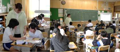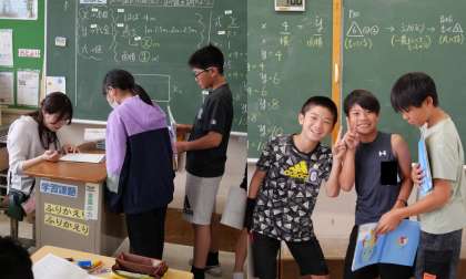 (写真下)6年3組 算数科:練習問題に取り組んでいます。自分のペースで問題を解きながら、教科担任に確認してもらっています。カメラを向けると、思わずポーズを決めてくれる6年生でした。