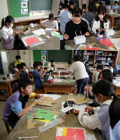 (写真中)6年2組 図画工作科:しかけのある作品づくりに取り組んでいます。スムーズに回るように、針金の位置やハンドル部分を工夫しています。