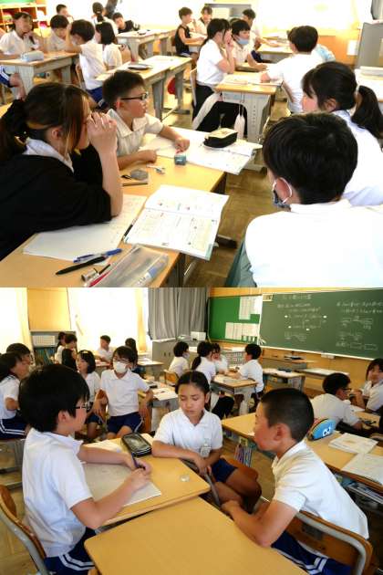 (写真上)5年1組 算数科:小数のかけ算について学習を進めています。問題文をもとにまずは関係図に表し、そこからことばの式で考えていきます。自分の考えをグループ内で伝え合いながら、解く道筋を確認し合っています。