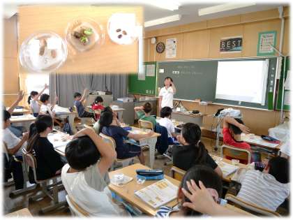 (写真下)5年2組 理科:発芽の条件について、水、空気、温度の条件を変えた種子の様子を観察をしながら、必要な条件を考え合っています。