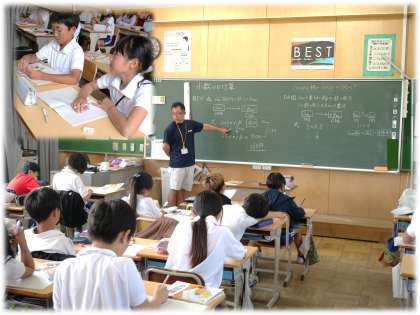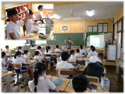 (写真下)5年2組 算数科:小数のかけ算の学習を進めています。3×0.8の積が3より小さくなるのかをまずは自分なりにじっくり考えています。