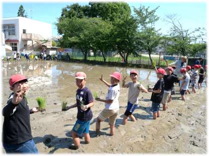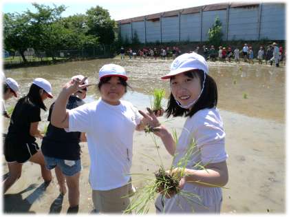 時々、土の中からカエルやオタマジャクシなどが出てきて驚きながらも、田植えの作業を楽しむ5年生の姿が見られました。