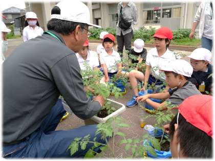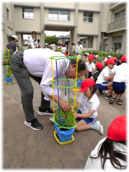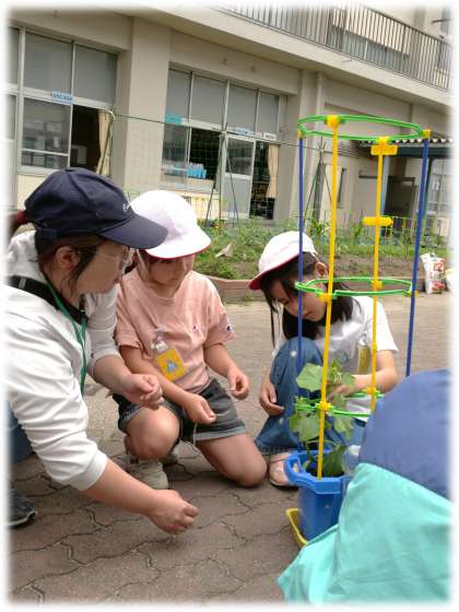 脇芽がどれなのか教えてもらったり、支柱を立てるときに茎が折れないようにサポートをしてもらったりと、保護者ボランティアの方にも活動を支えてもらいました。