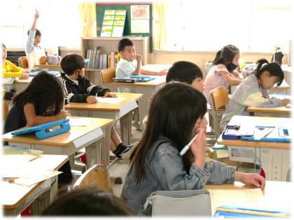 (写真上)2年1組 生活科:自分の夏野菜の観察記録を書いています。学習用タブレットで写真をとったり、ものさしで茎や葉の大きさを測ったりしながら、自分の大切な夏野菜の様子をじっくり観て、気づいたことを観察カードに書いていました。