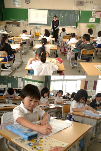 (写真中)2年2組 国語科(書写):字間を意識しながら、フェルトペンで漢字を書いています。「姿勢も意識するとすてきですよ」との先生の声かけに、背筋がぴんと伸びる2年生です。