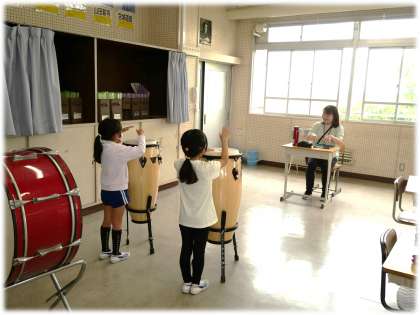 (写真下)2年3組 音楽科:「BINGO」の歌唱テストを2人ずつ行っています。太鼓をリズムよく叩きながら、元気よく歌っています。