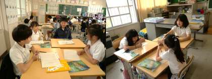 (写真上)3年1組 国語科:「全体と中心」を捉えるために、教材文をもとに何を伝えるとよいのか、自分の考えを班の中で伝え合っています。